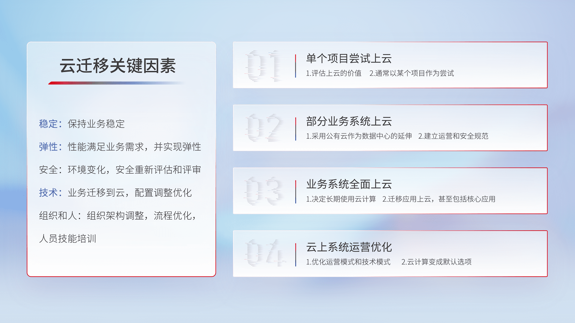 结合实际业务,,,,从规划设计、、、、云平台选型、、云原生改造、、、数据迁移、、集成交付,,,迁移全过程为客户识别最佳上云路径,,,做好风险识别管理,,设计网络架构、、、、身份权限、、、安全审计合规、、、操作审计、、、日志审计、、、、监控告警策略、、、、多站点容灾设计等,,对云上基础设施进行整体规划,,,提升IT治理水平,,以满足弹性、、、高可用、、、、高性能的需求。。