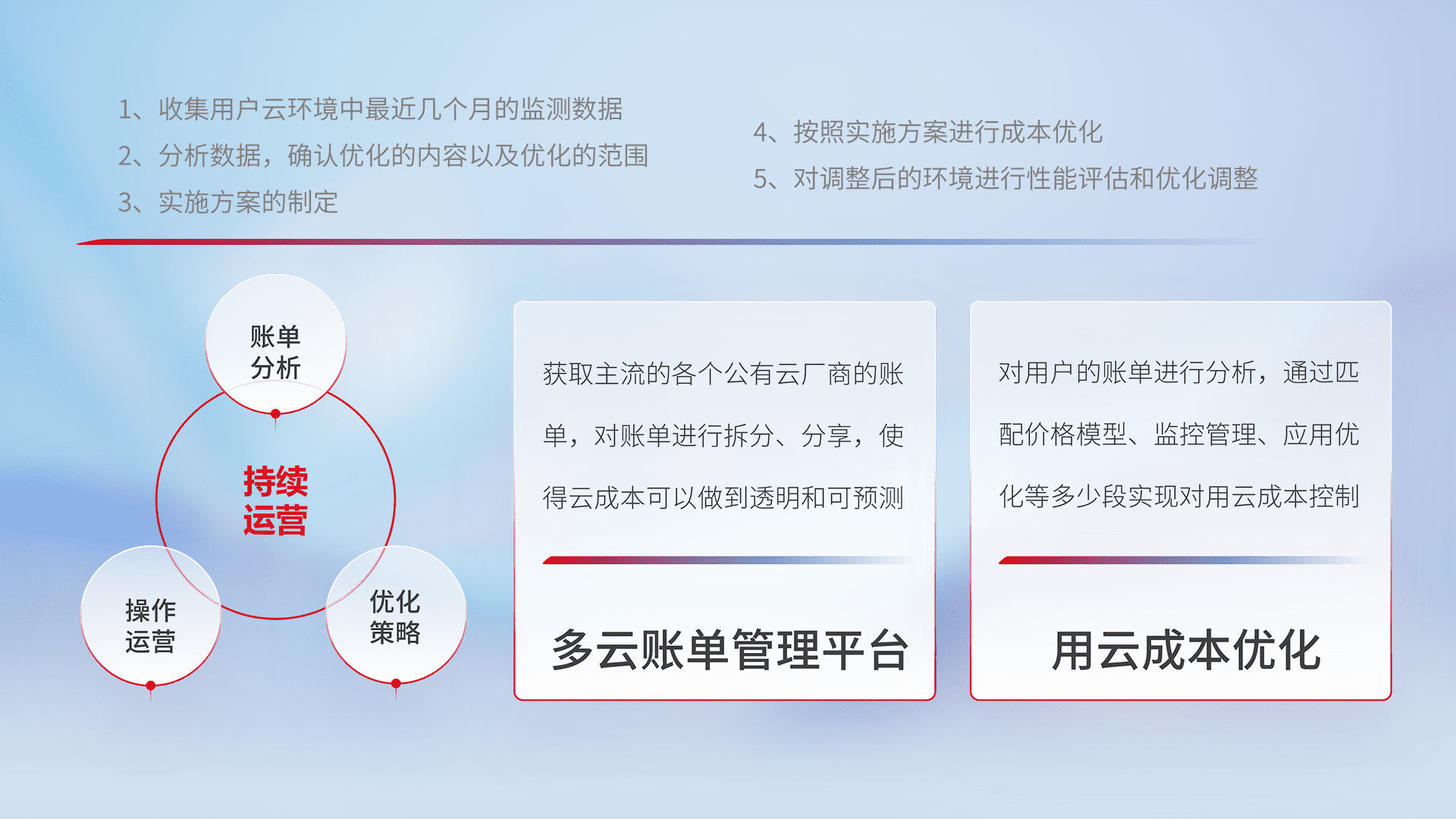 通过多云纳管,,,,以统一的资源数据模型把客户的云资源进行抽象和封装,,,进而实现对多云资源的统一操作,,保障云资源管理的可靠性、、、稳定性与可用性。。量身定制化运维内容,,,配置、、、、开发运维、、、、补丁管理、、、备份、、、监控、、、认证和访问管理、、、、审计和日常巡检等,,,,保障在用云过程中的可靠度,,稳定度以及高可用率。。。。