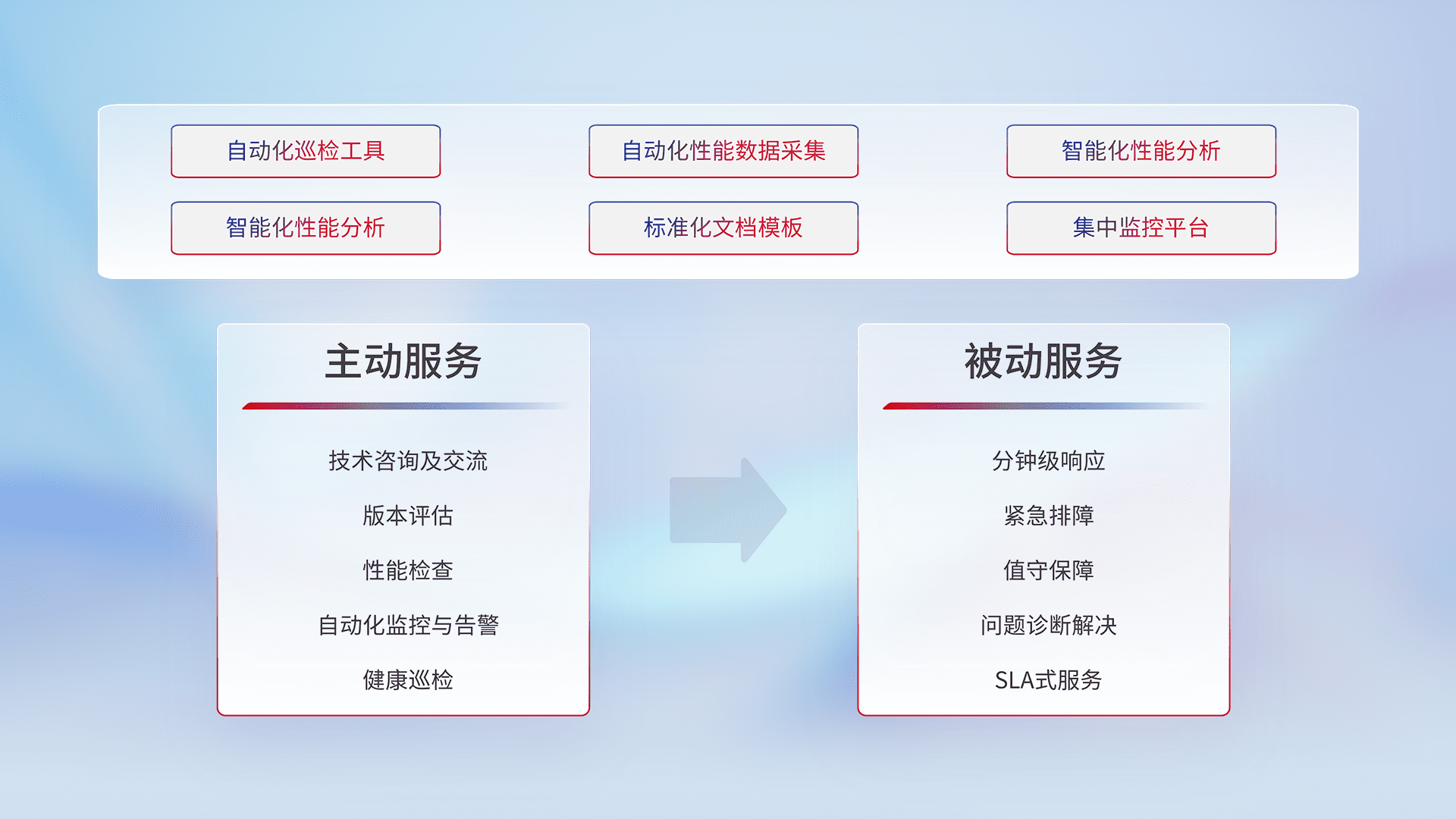 智能化工具和标准化文档,,,保障服务质量,,,,提供主动服务(包含技术咨询、、、版本评估、、、、性能检查、、自动化监控与告警、、、健康巡检)和被动服务包含(分钟级响应、、紧急排障、、、值守保障、、、、问题诊断解决、、、、SLA服务)。。